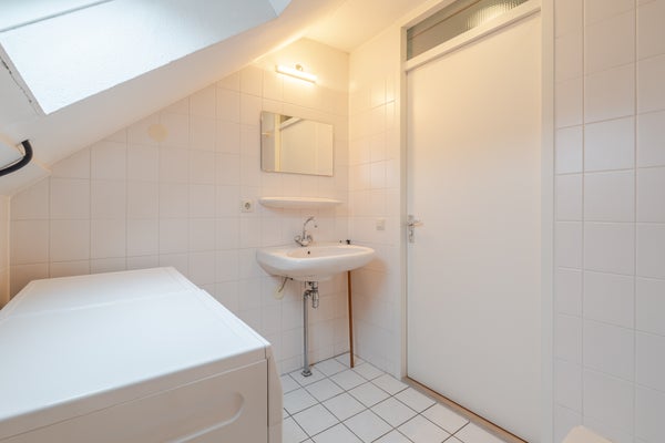 Badkamer (ca. 4 m²) voorzien van een douchebak, wastafel, Velux dakraam en aansluitingen voor de wasapparatuur.