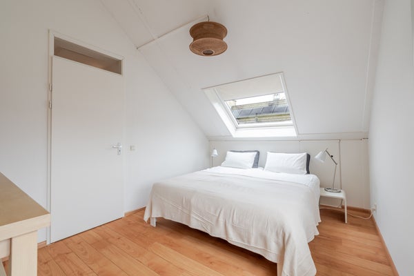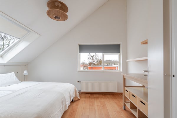 Slaapkamer 4 (ca. 11 m²), gelegen aan de achterzijde, eveneens met een hoog plafond en Velux dakraam.