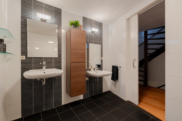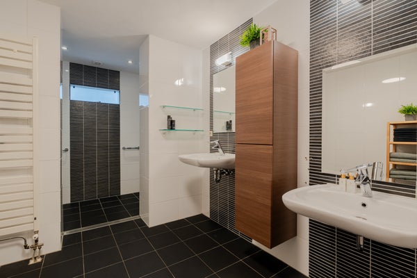 De badkamer is voorzien van een dubbele inloopdouche, dubbele wastafel en een handdoekenradiator.