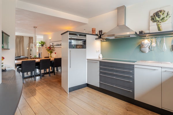 De moderne open keuken (ca. 13 m²) beschikt over een nette keukeninrichting met een stijlvol terrazzo aanrechtblad, een 1,5 spoelbak met Quooker en de volgende inbouwapparatuur: inductiekookplaat, afzuigkap, koelkast met vriesvak, combi magnetron-/oven en vaatwasser.
