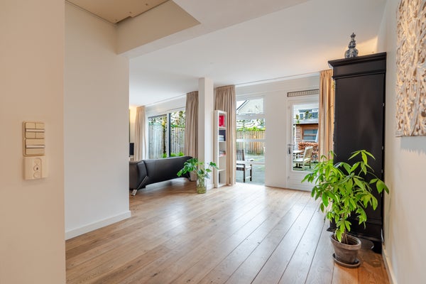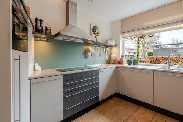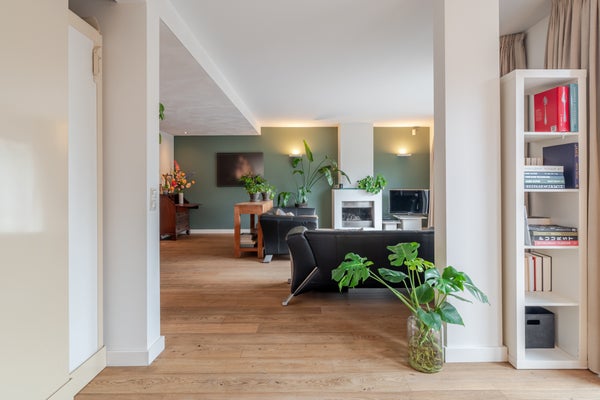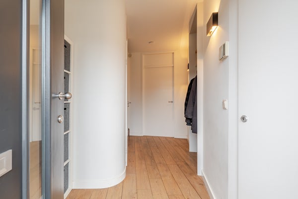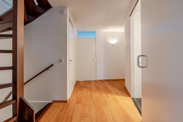De hal, woonkamer en keuken zijn afgewerkt met een massief houten parketvloer, wat zorgt voor een warme en luxe uitstraling.