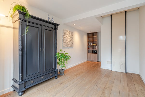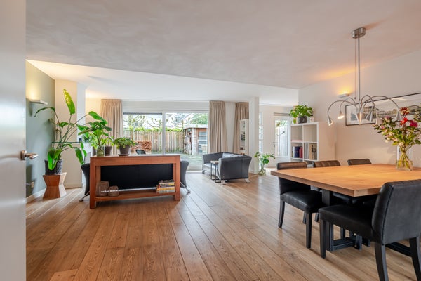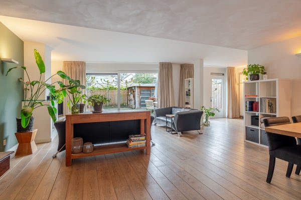 De royale woonkamer (ca. 60 m²) is een heerlijke leefruimte en voorzien van een sfeervolle haard, een schuifpui én een separate deur naar de tuin. De ruimte is praktisch ingedeeld met een zit- en eethoek, een aparte studiehoek en ruimte voor een interne lift.