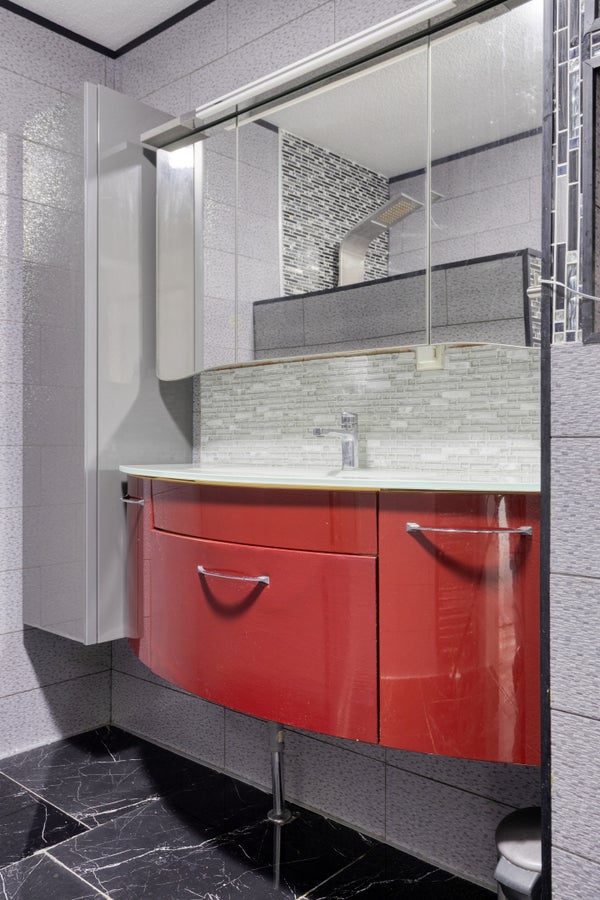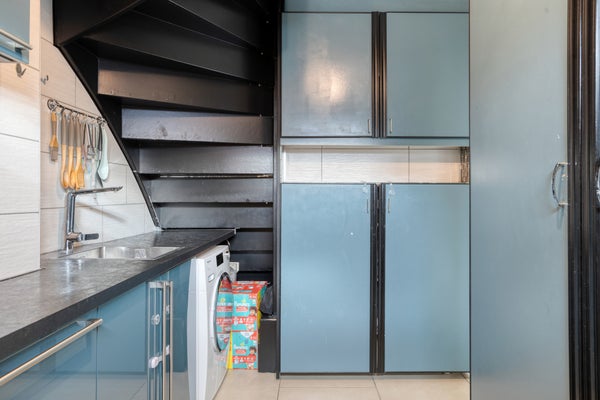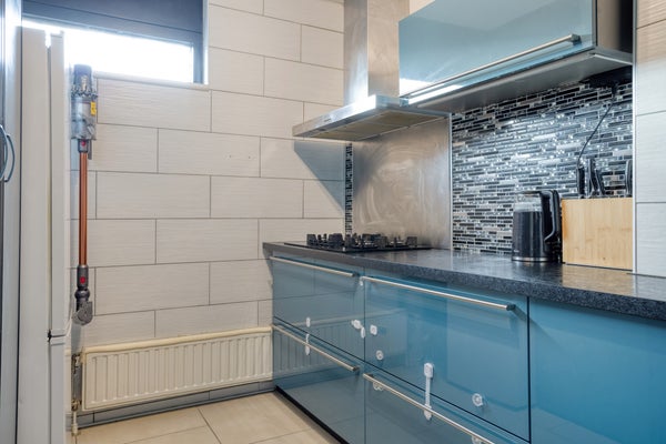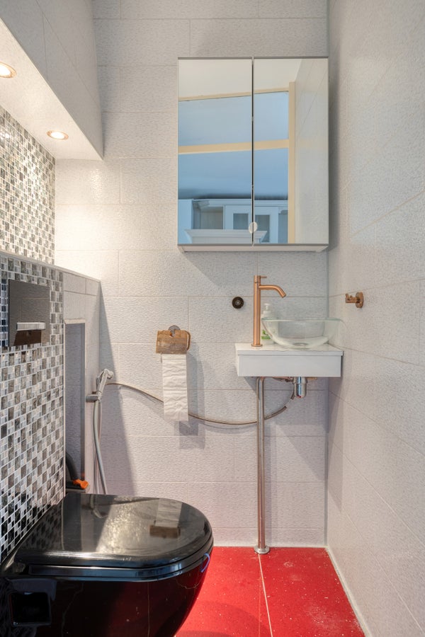 Deze nette inbouwkeuken is uitgerust met een rvs design afzuigkap, een 4-pits gaskomfoor met 1 wokbrander, een wasmachine-/drogeraansluiting. Het kleurrijke design toilet heeft een zwart vrijhangend toilet en een glazen waskom.