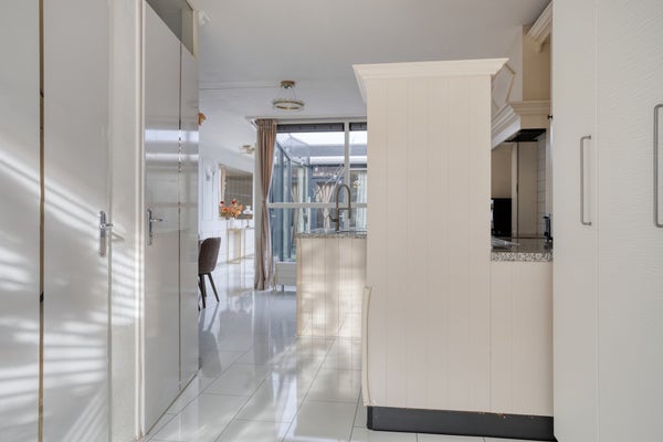 Via een overdekte entree is de hal bereikbaar. Vanuit de halfopen hal zijn de praktische bijkeuken, het vrijhangend toilet en de unieke woonkeuken toegankelijk. De praktische bijkeuken, heeft een hoog geplaatst raam, een loopdeur naar de voortuin en een 2e inbouwkeuken.