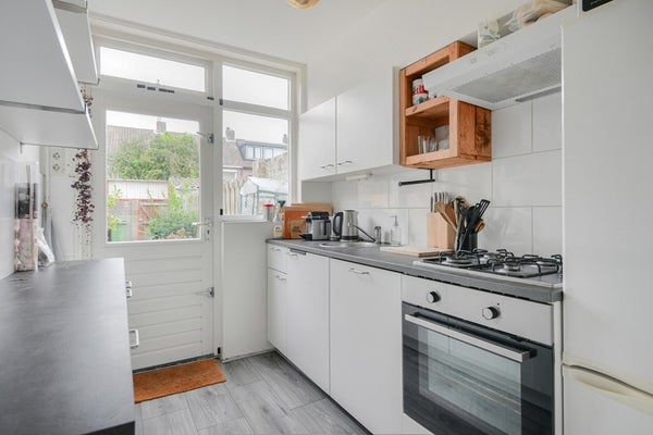 In de keuken (ca. 2,10 bij 2,85 m.) vindt u een keurig keukenblok aan twee zijden met inbouwapparatuur (2022). De keuken ligt aan de achterzijde van de woning. Ook hier ligt een bruin/grijze laminaatvloer. Vanuit de keuken kunt u naar de achtertuin.