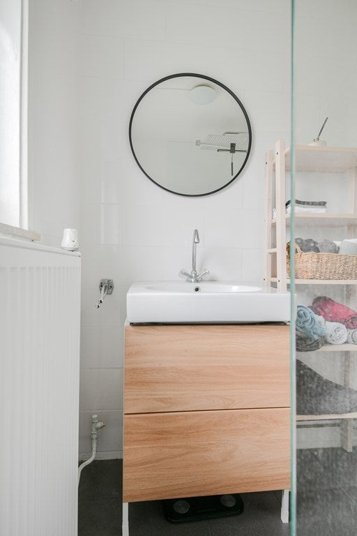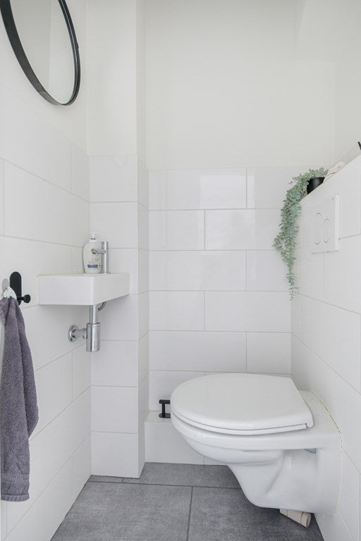 De betegelde badkamer is 2,08 bij 1,52 m. en ligt aan de voorzijde van de woning. De badkamer heeft een raam t.b.v. daglicht en ventilatie, een wastafel met meubel en douche met glazen wand en thermostatische kraan.