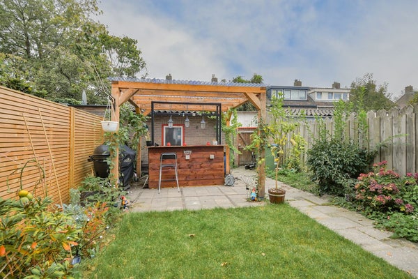 De -op het oosten gelegen- achtertuin is maar liefst zo’n 12,91 m. diep en 6,40 m. breed. De tuin is diep genoeg om te kunnen genieten van de zon. De achtertuin is voorzien van borders met vaste beplanting, sierbestrating, een watertappunt en een lamp aan de achtergevel.