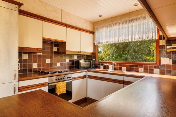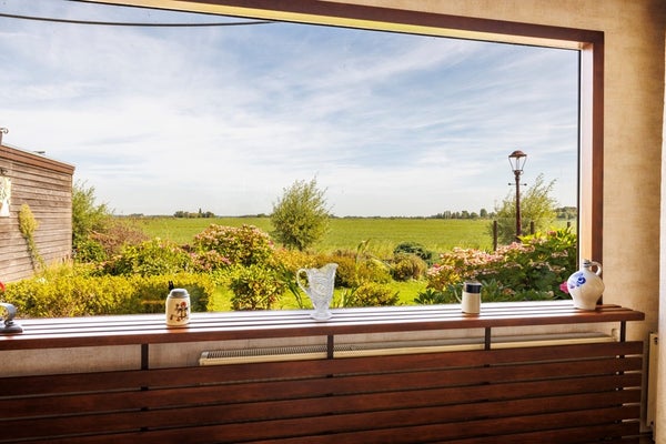 De woonkamer met open U-vormige keuken vormt het hart van de woning. Vanuit hier geniet u van een geweldig en vrij uitzicht over de landerijen. Dit uitzicht verveelt nooit: elke dag een nieuw schilderij!