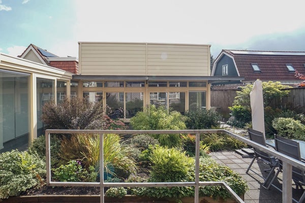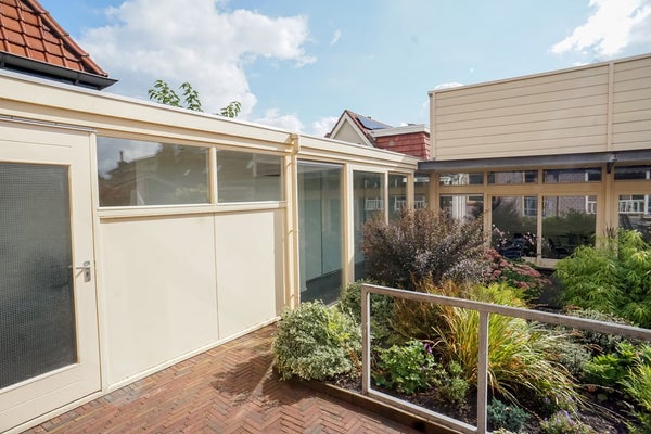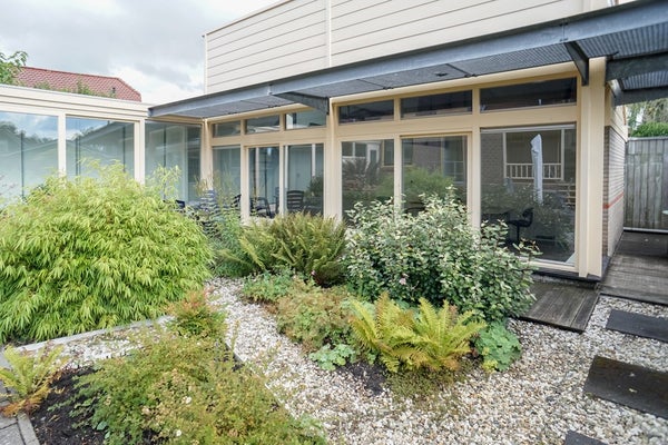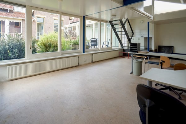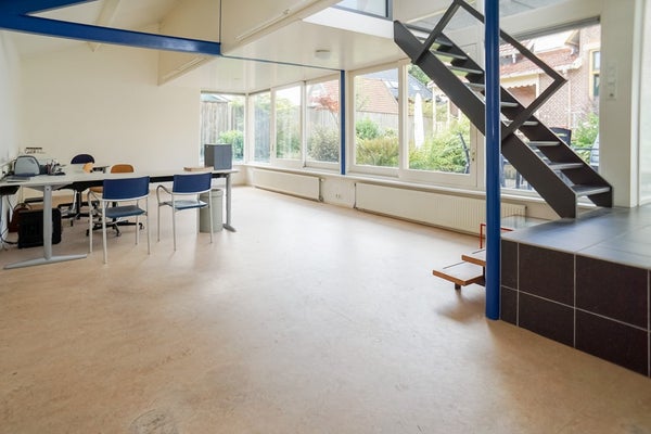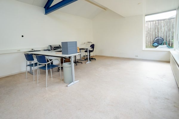 Achter de woning is in 2000 een modern kantoor/atelier/studio gerealiseerd. Deze ruimte is uitstekend geïsoleerd, voorzien van vloerverwarming en beschikt over een eigen ingang, pantry en toilet. Dankzij de grote raampartijen, schuifdeuren en hoge plafonds is het hier heerlijk licht en ruimtelijk.