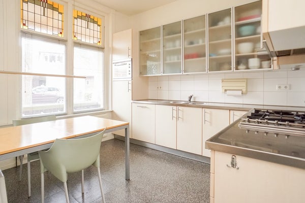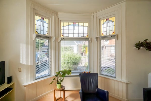. In de woning zijn in de woonkamer en keuken glas in lood bovenlichten aan de buitenkant voorzien van voorzetramen.