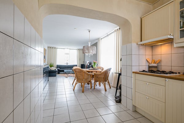 Met een Gemeentelijke diepe voortuin komen we via de voordeur in de lange hal. In die hal bevinden zich de meterkast, trap naar de kelder en toegangsdeur tot de woonkamer. De ruime woonkamer wordt door de ramen aan 2 zijden, mooi verlicht. Achter de woonkamer vinden we de open keuken met L-opstelling en diverse inbouwapparatuur, w.o. vaatwasmachine, gaskookplaat en afzuigkap. Het houtkleurig werkblad is voorzien van een enkele ronde spoelbak met kraan.