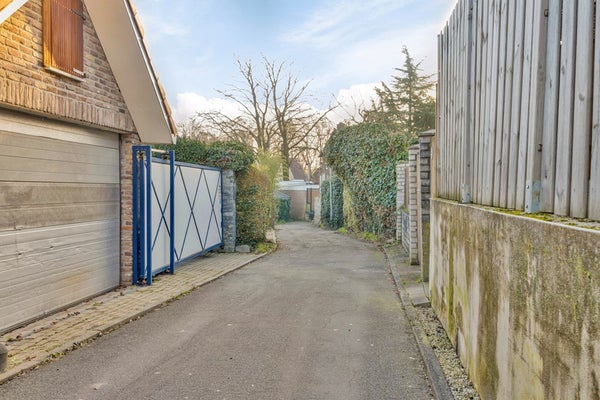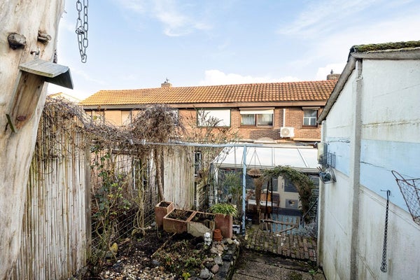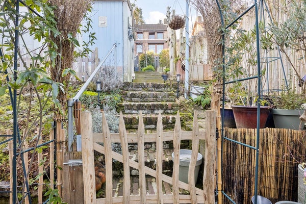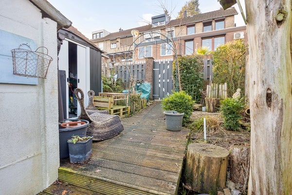 Fraaie tuin met goede privacy. De tuin is afgewerkt met een overdekt terras, gemetselde trap, houten vlonders, diverse borders met beplantingen, gemetselde tuinberging en nieuwe stalen tuinberging. Nieuwe houten poort aan achterzijde geplaatst. Ruimte voor het realiseren van een garage aan de achterzijde van het perceel.