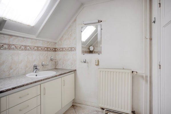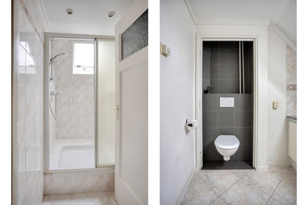 Een knusse, volledig betegelde doucheruimte met een douchecabine met thermostaatkraan en een dakraam. De gedeeltelijk betegelde toiletruimte heeft een wandcloset met opzetplateau en een badmeubel met vaste wastafel. Natuurlijke ventilatie middels een dakraam.