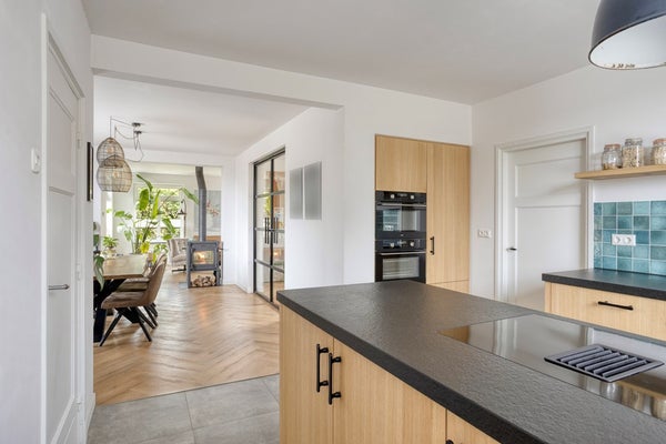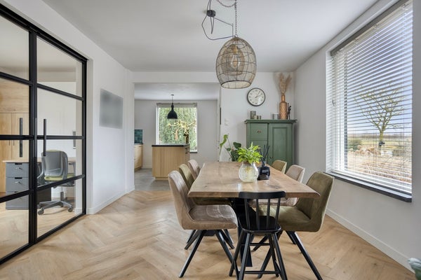 Vanuit de keuken naar de eetkamer/woonkamer en de bijkeuken. De eetkamer / woonkamer en werkkamer zijn voorzien van PVC vloer met vloerverwarming, stucwerk wanden en stucwerk plafonds. Vanuit de centraal gelegen eetkamer een mooi zicht op de straat, de werkkamer en de woonkamer, welke is gelegen in de recent aangebouwde woonkamer. Tussen de eet- en woonkamer staat een sfeervolle 'Jacobus' doorkijk houtkachel. De aanbouw is volledig voorzien van kunststof raamkozijnen met HR++ beglazing.