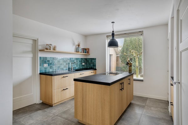 Toegang tot de woning middels een hardhouten voordeur met bewerkt glas. Entree met een tegelvloer, een garderobehoek en vernieuwde meterkast (o.a. 7 groepen + aardlekschakelaars + PV groep). Vanuit de entree naar de eetkeuken, voorzien van een tegelvloer met vloerverwarming, stucwerk wanden en -plafond. De luxe keukeninrichting (2022) is voorzien van een hardstenen (gezoet) aanrechtblad met een 'Franke' spoelbak met messingkraan. Het kookeiland is voorzien van een inductiekookplaat met bladafzuiging. In een aparte wand bevindt zich de combimagnetron, een stoomoven, een vaatwasser, een koelkast en een vriezer (2 laden). Er is zelfs een aparte koffie/thee corner gerealiseerd. Middels een hardhouten raamkozijn met dubbele beglazing en een rolluik zicht op de oprit. Onder de trapopgang bevindt zich een volledig betegelde verdiepte (droge) kelder.