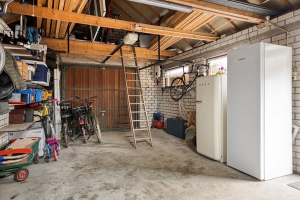 Vanaf de diepe en bestrate oprit via een, op afstand te bedienen hardhouten kantelpoort toegang tot de vrijstaande garage, oppervlakte ca. 36 m². Met een betonvloer, spouwmuren en een zadeldak met een gedeeltelijke bergzolder. Hier bevindt zich de omvormer t.b.v. de 10 zonnepanelen. De ruime garage is ook bereikbaar vanuit de tuin middels een houten terrasdeur.