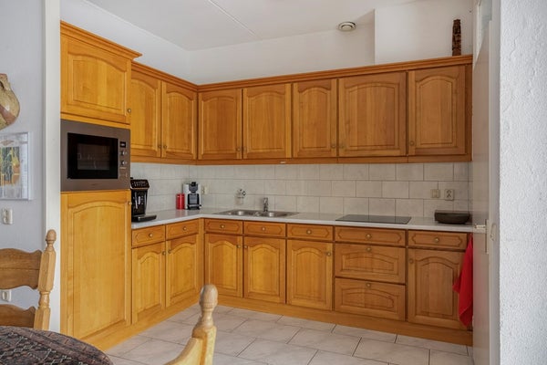 De halfopen keuken staat in verbinding met de woonkamer en heeft ook een lichte tegelvloer met vloerverwarming. De licht eiken keukeninrichting in een hoekopstelling is voorzien van een kunststof aanrechtblad met dubbele RVS spoelbak, een inductiekookplaat, een afzuigkap, een koelkast en een combimagnetron/ heteluchtoven.