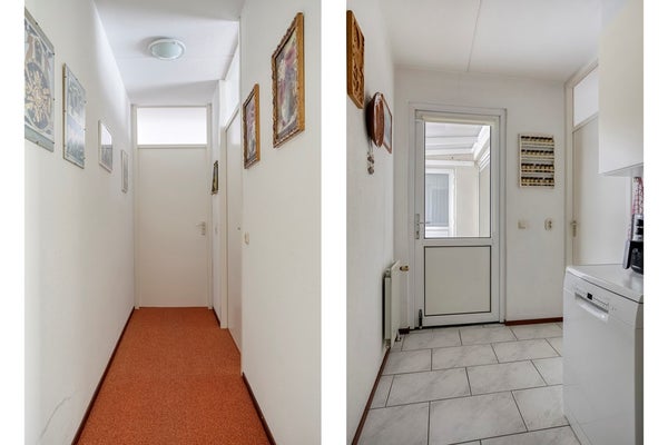 Vanuit de bijkeuken naar een gang met toegang tot de badkamer en een 2-tal slaapkamers.