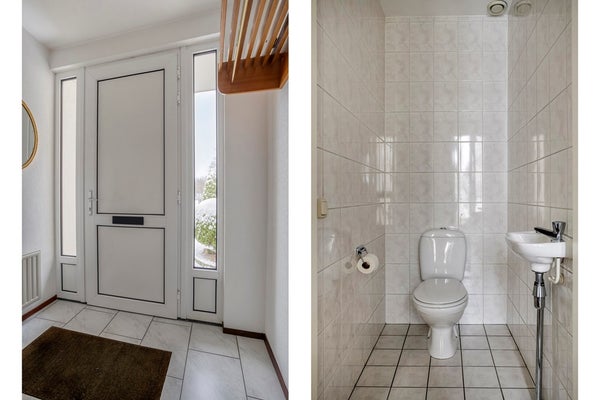 Via een kunststof voordeur toegang tot de royale entree. Met een lichte tegelvloer, spachtelputz wanden en een spuitwerk plafond. Moderne meterkast (o.a. 6 groepen + 2x aardlekschakelaar+ glasvezel). Het volledig licht betegelde toilet met spuitwerk plafond is voorzien van een duoblok, een fonteintje en mechanische afzuiging.
