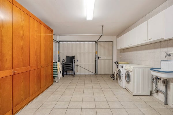 Via een deur in de keuken naar de bijkeuken. De bijkeuken heeft ook een lichte tegelvloer met vloerverwarming, spachtelputz wanden en een spuitwerk plafond. Hier bevindt zich de Remeha Calenta HR combiketel (2009), de unit van de vloerverwarming (3 groepen) en de unit van de mechanische ventilatie. Ook bevinden zich hier de aansluitingen voor de wasapparatuur of vaatwasser. Via een kunststof terrasdeur met dubbele beglazing toegang tot het overdekte terras.