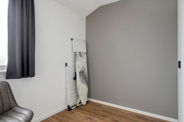 De slaapkamer aan de voorzijde, over de gehele breedte, heeft een laminaatvloer, stucwerk wanden en een stucwerk plafond met inbouwspots. Daglicht middels een hardhouten raamkozijn met vliegenhor en een rolluik.