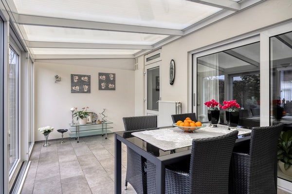 Aan de achterzijde van de woning is over de volledige breedte een serre geplaatst met tegelvloer en een grote schuifpui naar het terras. Het dak is uitgevoerd in polycarbonaat en dankzij de elektrische luifel kan de zon eenvoudig worden geweerd. Een heerlijke plek om het hele jaar door van binnen én buiten te genieten.