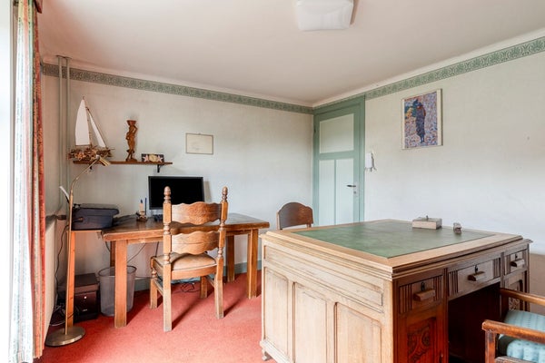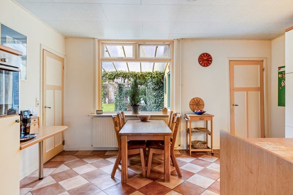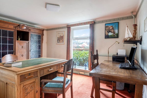 Vanuit de eetkeuken met een paneeldeur naar de opkamer c.q. werkkamer, met vloerbedekking, behangen wanden en een stucwerk plafond. Daglicht middels een hardhouten raamkozijn met HR++ beglazing. Zicht op de zijtuin met diepe oprit.