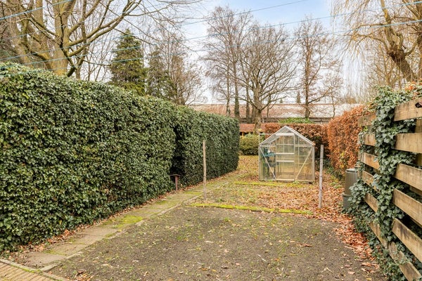 Aan de linkerzijde van de woning bevindt zich een diepe, bestrate oprit, welke o.a. via een poort toegang geeft tot de prachtige vrije achtertuin. Direct aan de woning bevindt zich een (stalen) terrasoverkapping. De 'parkachtige' achtertuin is volledig omheind met o.a. oude beuken en draadwerk. Met een groot gazon, aangeplante borders met volwassen beplanting en bomen. Verder een 'speelse' muur met diverse doorkijken. Ook is er een ingegraven zwembad met filter en trapje aanwezig. Achterin de tuin staat een grote houten tuinberging met elektra. Verder is er een moestuin met een bloemenkas en een grondwaterpomp.
