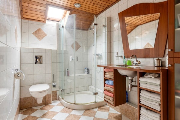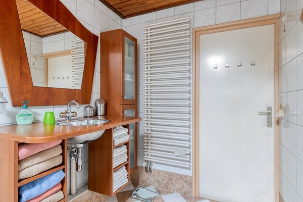 De volledig licht betegelde 2e badkamer met een schroten plafond met inbouwspots is voorzien van een badmeubel met een RVS wastafel met spiegel, een douchecabine met een thermostaatkraan en een wandcloset met opzetplateau. Natuurlijke ventilatie middels een Velux dakraam met dubbele beglazing.