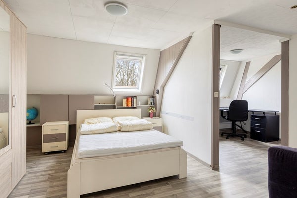 De slaapkamer aan de voorzijde heeft een laminaatvloer, behangen wanden en een 'Agnes' platen plafond met inbouwspots. Daglicht middels een 2-tal Velux dakramen met dubbele beglazing en een verduisteringsrolgordijn.