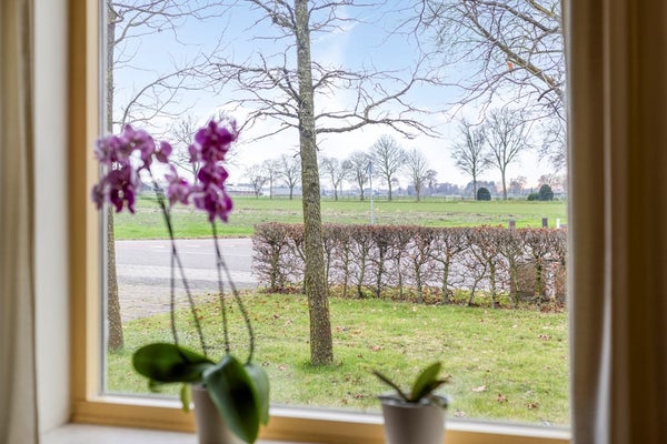 De riante woonkamer heeft een eiken parketvloer, stucwerk wanden en een sier balkenplafond. Met een hoekschouw voorzien van een sfeervolle houtkachel. Vanuit de woonkamer een prachtig weids uitzicht, aan de voorzijde, over de akkers middels diverse hardhouten raamkozijnen met HR++ beglazing.