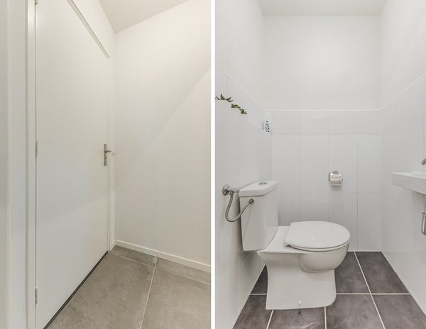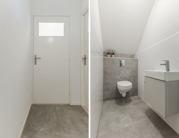 Overloop; 2 slaapkamers; betegelde toiletruimte met wandcloset en meubel met fonteintje.