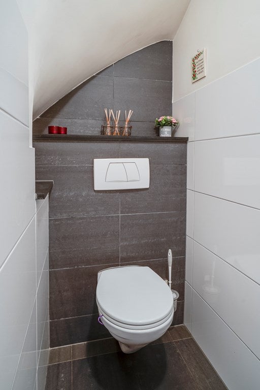 De in 2007 gemoderniseerde badkamer is uitgerust met een ligbad-douchecombinatie, toilet en wastafelmeubel. De antracietkleurige tegelvloer met vloerverwarming zorgt voor extra comfort en een luxe gevoel. De gehele eerste verdieping is afgewerkt met laminaatvloeren, wat bijdraagt aan een stijlvolle en warme uitstraling.