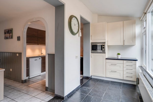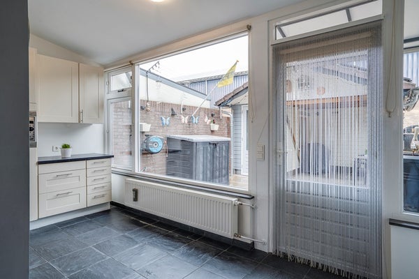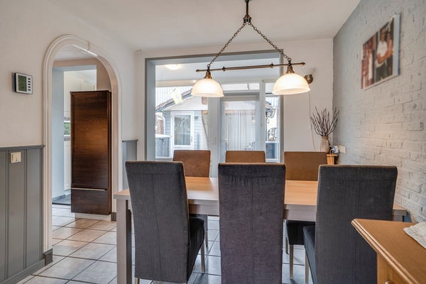 De ruime uitbouw aan de achterzijde, voorzien van een stijlvolle donkere natuurstenen vloer, biedt extra leefruimte en directe toegang tot de zonnige achtertuin. Zo ontstaat een natuurlijke verbinding tussen binnen en buiten en geniet je van een lichte, open en uitnodigende woonomgeving.