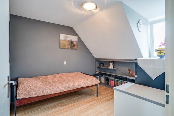 Via een vaste trap bereikt u de tweede verdieping, waar een ruime vierde slaapkamer is gesitueerd. Dankzij de dakkapel valt er volop natuurlijk licht binnen, waardoor de kamer een frisse en prettige uitstraling heeft. De kamer is afgewerkt met een laminaatvloer.