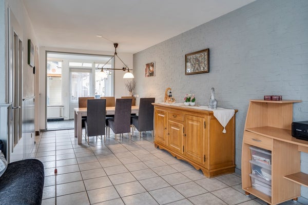 Bij binnenkomst via de voorzijde stap je de verzorgde hal binnen, sfeervol afgewerkt met een lichte tegelvloer. Vanuit deze ruimte heb je direct toegang tot de woonkamer, een praktische garderobe en de meterkast.