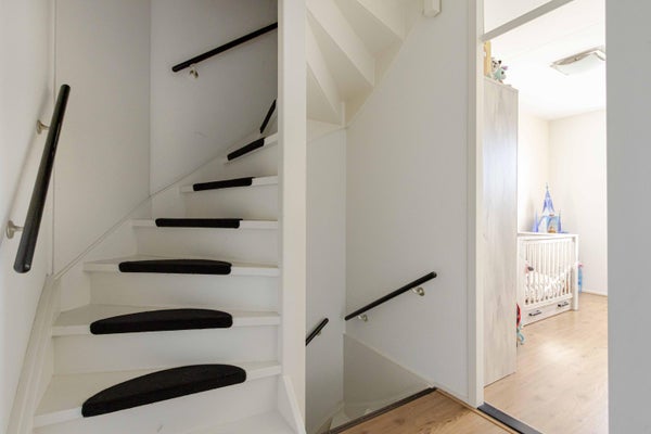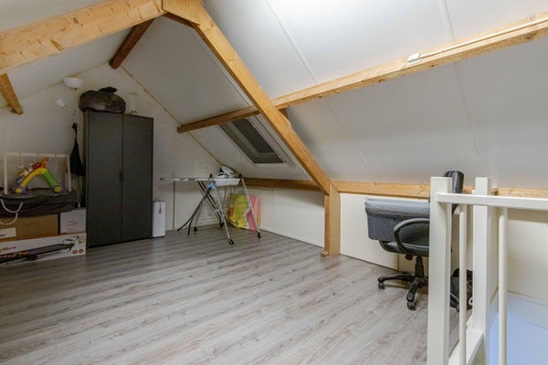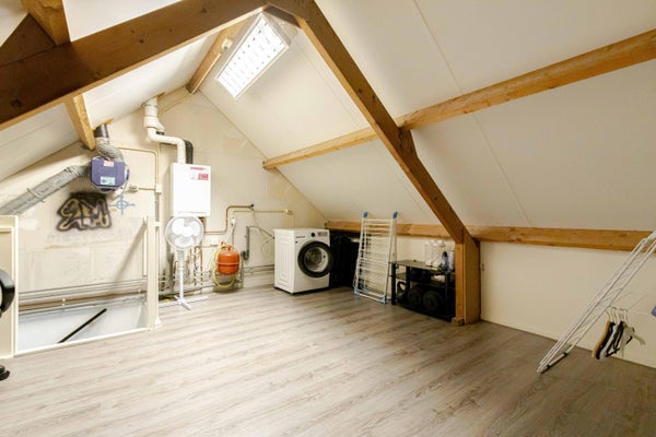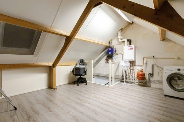 Via vaste trap te bereiken ruime zolderverdieping (ca. 16 m2 bij h > 1,50 m), aansluitingen witgoedapparatuur en plaatsing van de cv-combiketel (Intergas, bouwjaar 2016, huur Volta). Mogelijkheid voor de 4e slaap/hobbykamer.