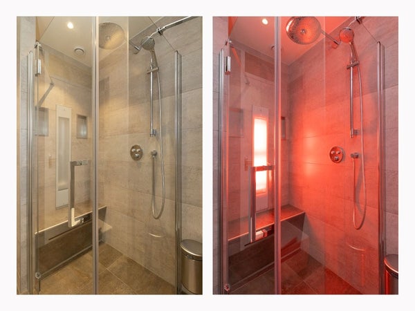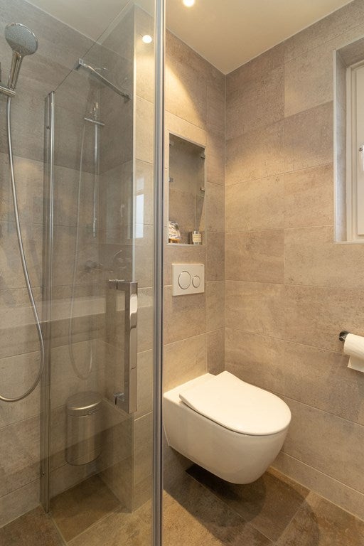 De badkamer is praktisch ingedeeld en voorzien van een (infrarood)douche, wastafel en toilet.