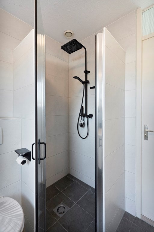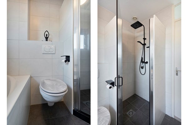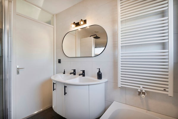 De badkamer is centraal gelegen en voorzien van een ligbad, douche, wastafelmeubel en toilet. Dankzij de efficiënte indeling is dit een complete en functionele ruimte.
