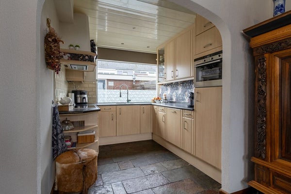 Aan de voorzijde bevindt zich de open keuken, geplaatst in een praktische opstelling met voldoende werk- en bergruimte. Vanuit de woonkamer is tevens de achterdeur bereikbaar, met directe toegang tot de tuin.