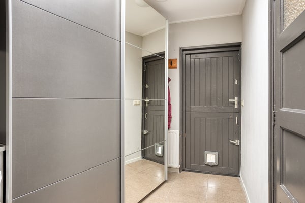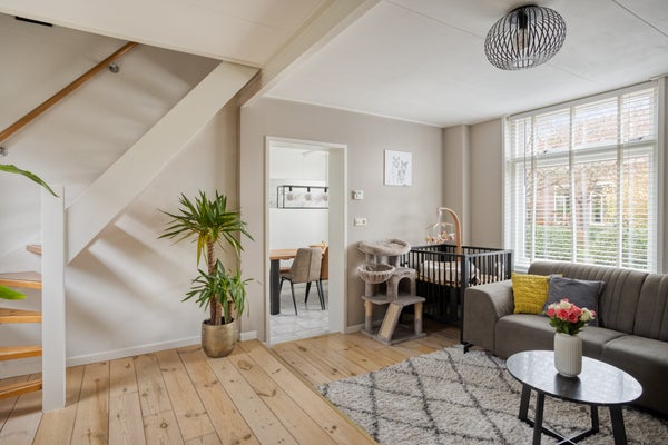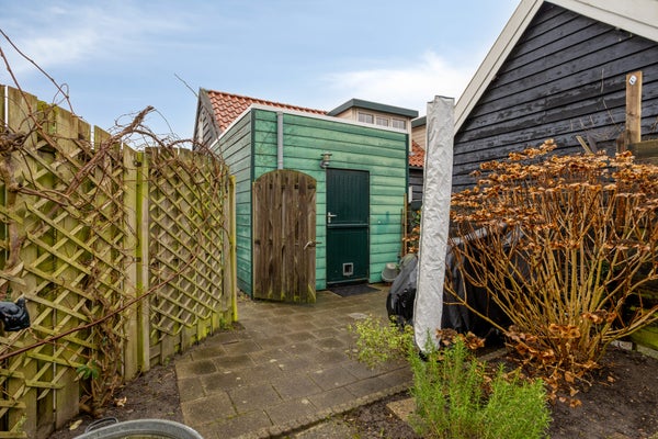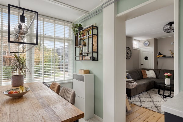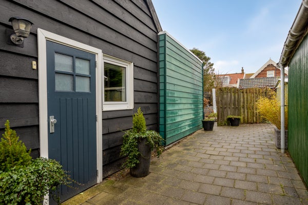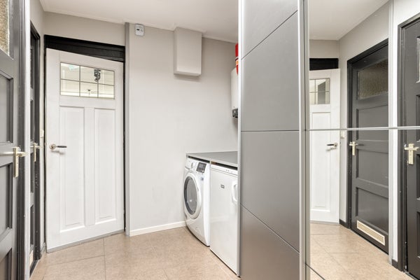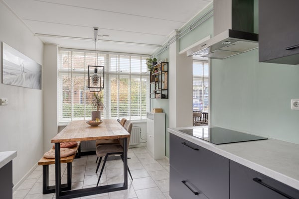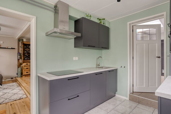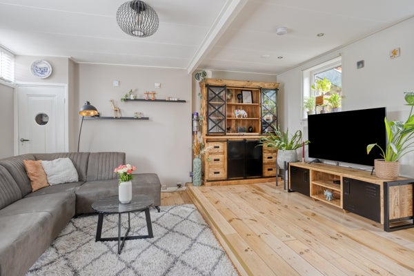 Bij binnenkomst via de keuken biedt de aanbouw uit 2012 praktische bergruimte en de badkamer met inloopdouche. De eetkeuken is voorzien van moderne apparatuur. De woonkamer met houten vloer biedt een speelse inrichting door een verhoging.