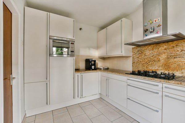 Aansluitend aan de woonkamer bevindt zich de keuken, die op prettige wijze is afgescheiden van de leefruimte. Deze is praktisch ingericht en voorzien van diverse inbouwapparatuur, waaronder een combi-oven, koelkast, vriezer, vaatwasser, gasfornuis en afzuigkap. De keuken biedt ruimte voor dagelijks gebruik en heeft eveneens de doorgang naar de achtertuin, waardoor koken en buiten eenvoudig met elkaar te combineren zijn.