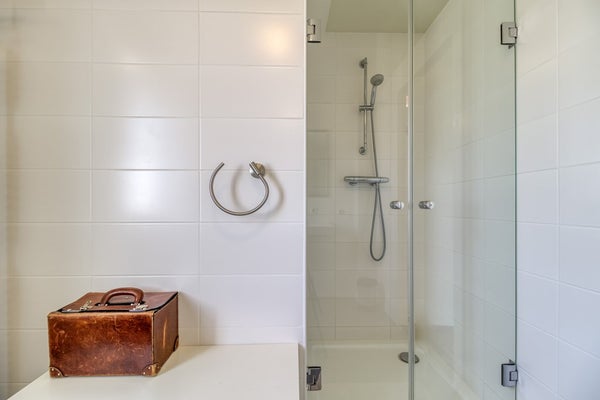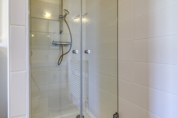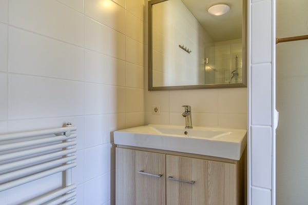 Deze badkamer is uitgerust met een douche, wastafel en een handdoekradiator.
