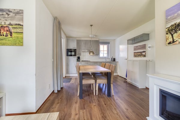 U komt binnen in de hal en van hieruit zijn de meeste ruimtes bereikbaar. Zodra u de woonkamer binnen komt valt direct het vele licht op wat binnen schijnt door de vele en grote raampartijen. Naast de zithoek is er een eethoek en een open keuken. De keuken is voorzien van alle nodige inbouw-apparatuur en bestaat uit; 4-pits gas- kookplaat, afzuigkap, spoelbak, combi- magnetron, koelkast met vriesvak en vaatwasmachine. Via de keuken komt u via de dubbele openslaande deuren op het overdekte en gedeeltelijk afgesloten terras.