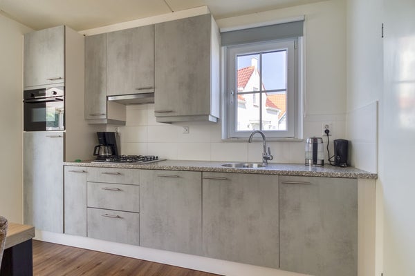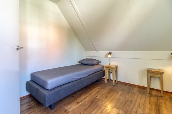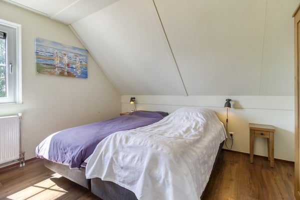Aangrenzend aan de keuken is er een bijkeuken/berging. Hier hangt de verwarmingsketel, is er een wasmachine-aansluiting en een buitendeur die uitkomt aan de zijkant van de woning. De berging is voldoende groot voor het opbergen van huishoudelijke spullen. De slaapkamer op de begane grond beschikt over een tweepersoonsbed, een eigen TV en een badkamer ensuite.