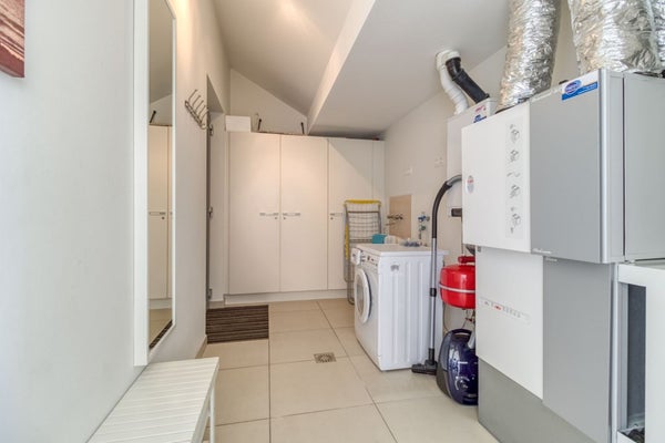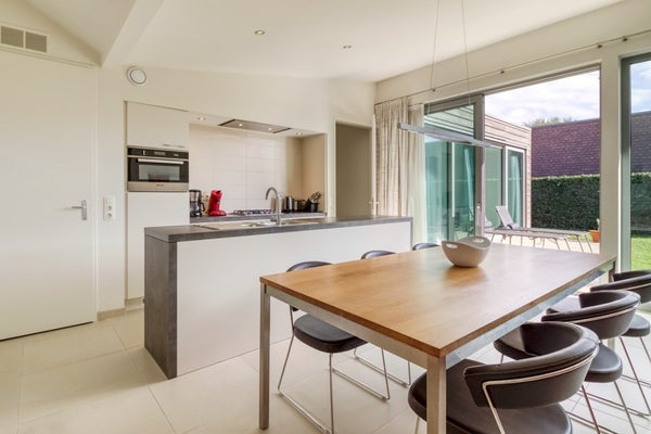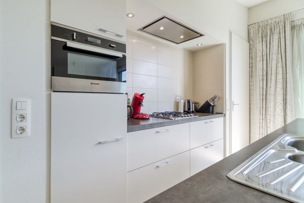 De woonkamer met zit- en eethoek is verrassend groot en aangenaam licht door de grote raampartijen met glas tot aan de grond. De tuin en het terras zijn te bereiken via een grote schuifdeur. De moderne keuken met eiland is voorzien van alle nodige en geïntegreerde inbouwapparatuur zoals 4 pits- gaskookplaat, afzuigkap, vaatwasmachine, koelkast met vriesvak en combi-magnetron. Naast de woonkamer bevindt zich de ruime bijkeuken/berging met cv-opstelling, wasmachine, uitstortgootsteen, er is ruimte voor het opbergen van huishoudelijk spullen en een deur om naar buiten te gaan.