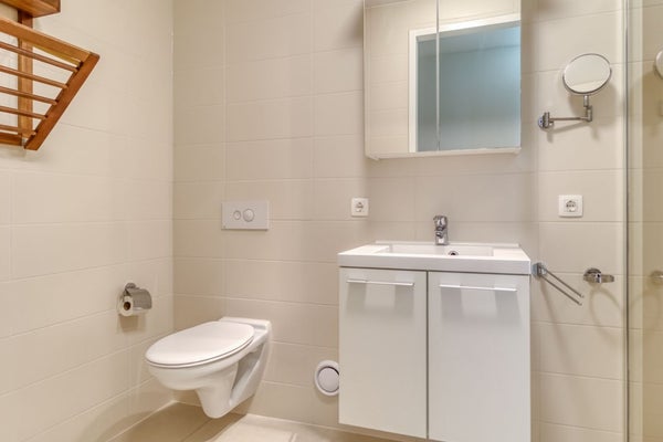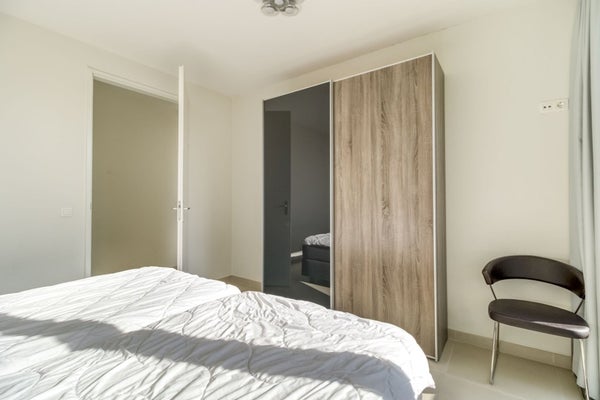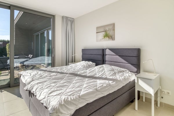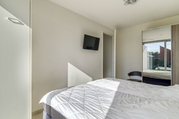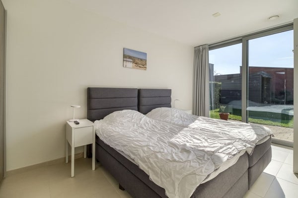 Er zijn twee ruime slaapkamers met grote raampartijen en met zicht op de tuin. Beide slaapkamers hebben een televisie-aansluiting en een schuifdeur naar het terras en de tuin. De badkamer is voorzien van inloopdouche, wastafel en toilet. Tevens is er een 2e toilet met fonteintje.