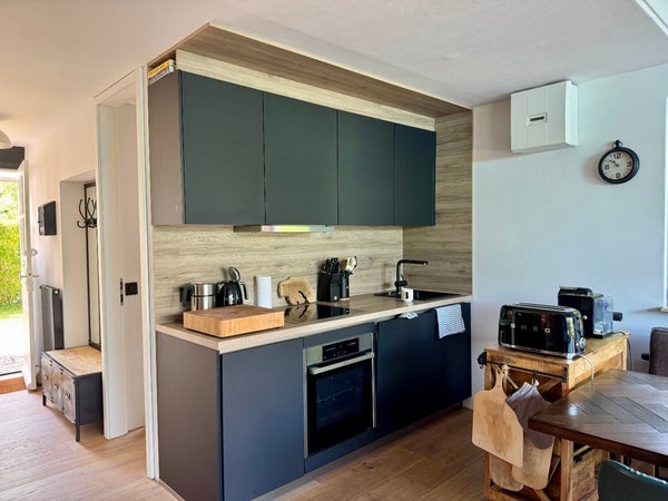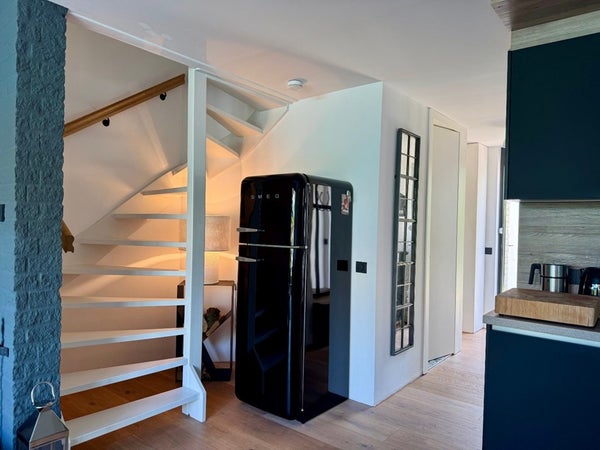 De open keuken is voorzien van: 4-pits inductie kookplaat, afzuigkap, spoelbak, oven, vaatwasmachine en aparte koel/vriescombinatie (Smeg).