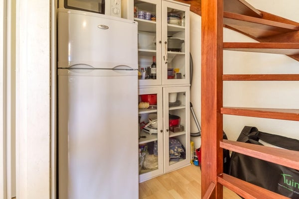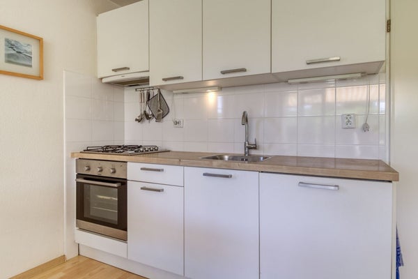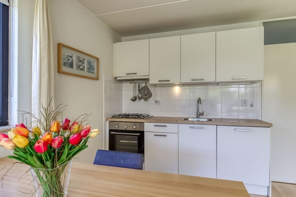 De open keuken is voorzien van: 4-pits gaskooplaat, afzuigkap, spoelbak en vaatwasmachine. De koel/vriescombinatie en combi-magnetron bevinden zich er net ernaast onder de trapopgang.