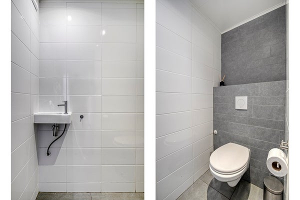 Toilet, geheel betegeld, voorzien van een hangend closet, een fonteintje en elektrische afzuiging.